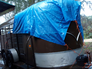 The trailer looks a bit silly with a bright blue 'cap' on the front, but things are much drier inside as a result. (I hasten to add that we don't leave the tarp on when we haul horses in the trailer!)